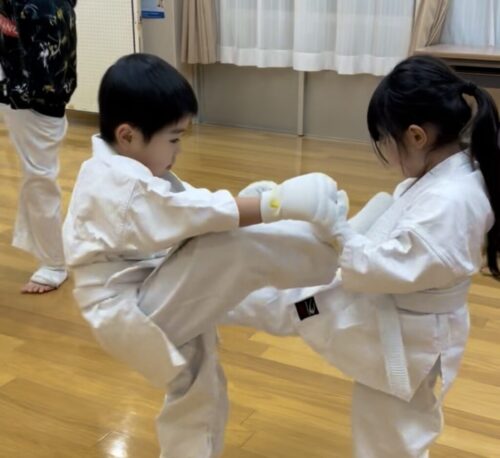 ▲果敢に前蹴りを放つ男の子。