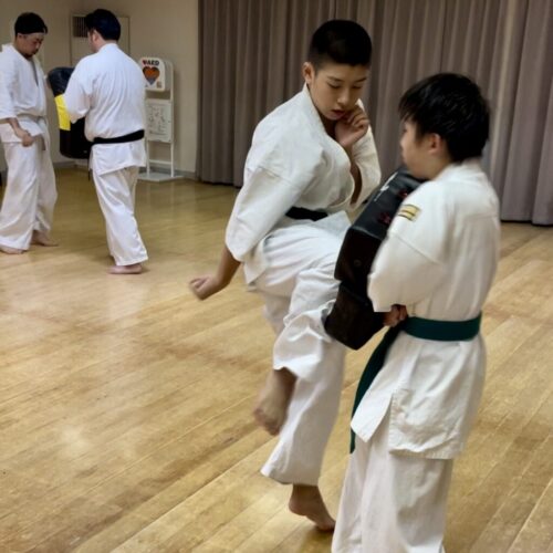 ミットを使って繰り返し繰り返し、蹴り技の反復練習です。